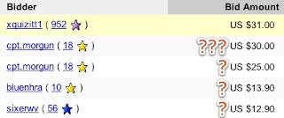 The wonder and amusement in this auction is brought to you by bidders cpt. morgun, bluenhra, and sixerwv. Sixerwv was the second person to bid - from the bid amount we can see that his bid was $12.90.